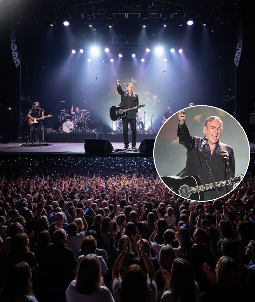 The crowd, spanning generations, sang along softly at first, then with growing confidence. It was not a sing-along fueled by nostalgia alone, but by gratitude. Gratitude for songs that stayed. Gratitude for an artist who never abandoned sincerity. In that moment, the distance between stage and seats disappeared. The performance felt conversational — as if Neil Diamond were speaking directly to each listener, reminding them of a version of themselves they once were.