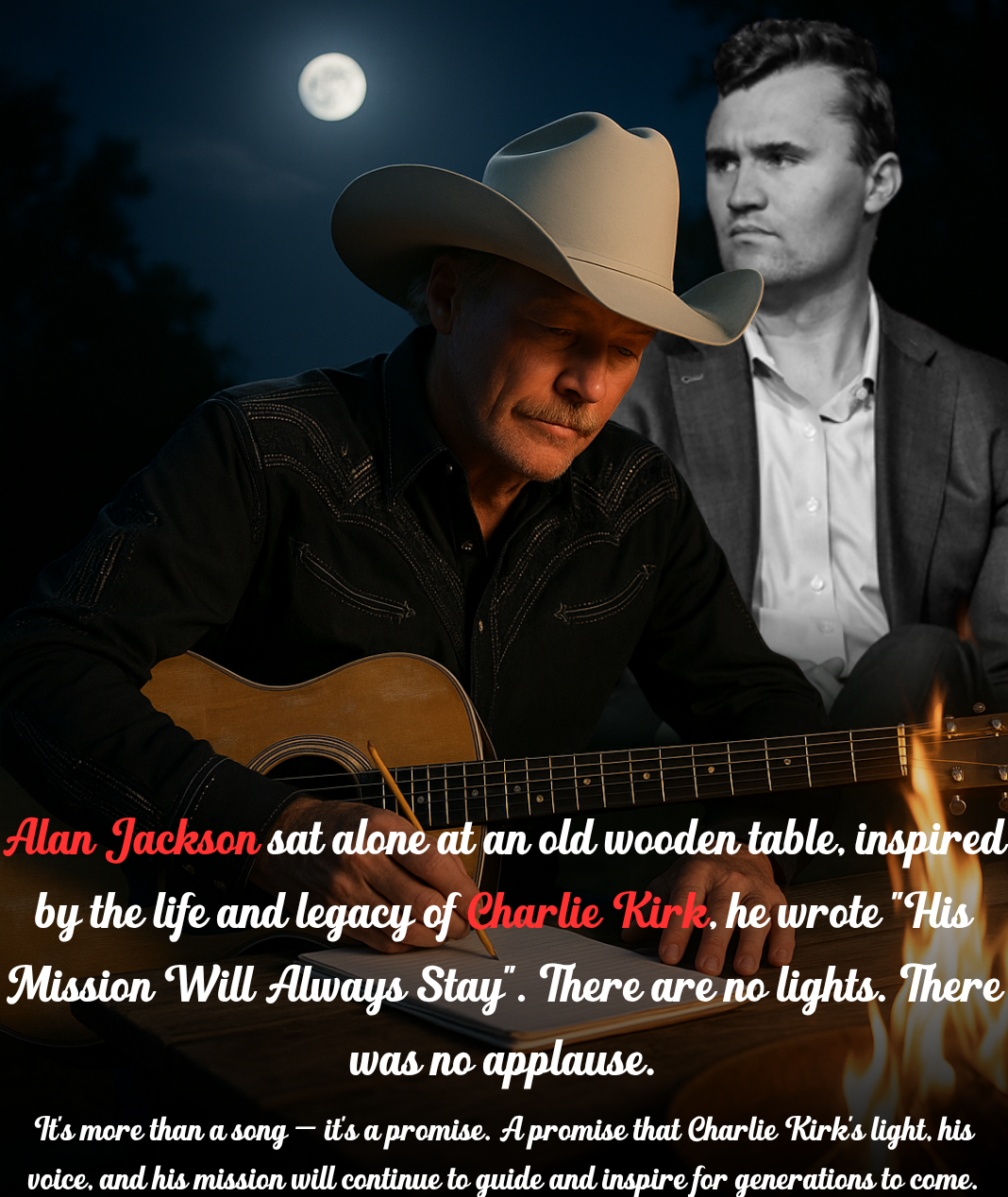 At 67, Alan Jackson has done it again — quietly, humbly, and with a depth only time can teach. Sitting alone at his old wooden desk, inspired by the life and legacy of Charlie Kirk, he wrote “His Mission Will Always Stay.” No spotlight. No applause. Just truth. Fans around the world are calling it haunting, unforgettable, and one of the most emotional masterpieces of his entire career…