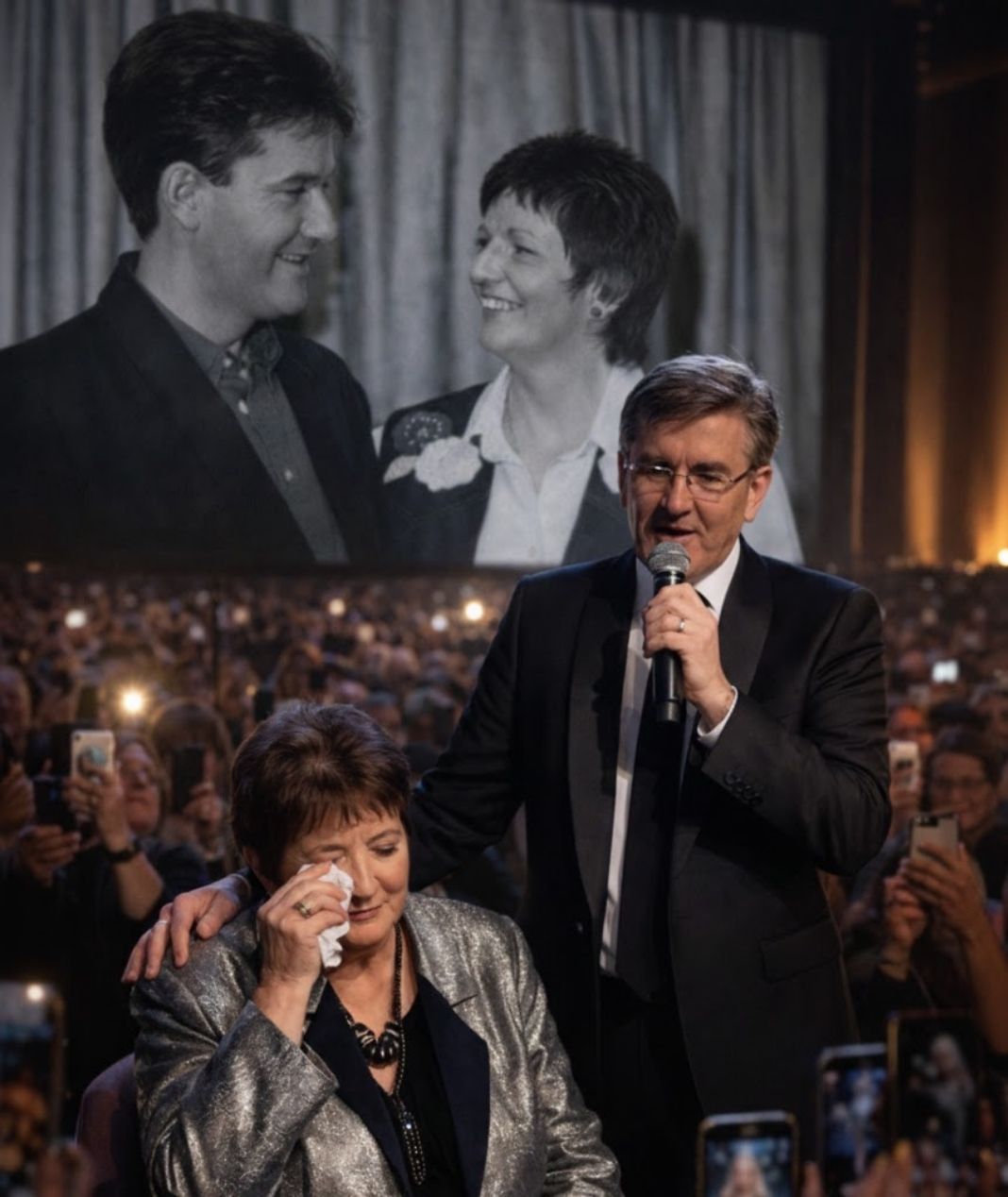 As the evening progressed, the audience believed they had already witnessed the heart of the celebration. Sixty years of music. Sixty years of resilience. Sixty years of a woman who carried Irish song across generations. Then the lights slowly dimmed. Conversations faded. A hush swept across the venue, the kind of silence that arrives before something meaningful, though no one yet knows why.
