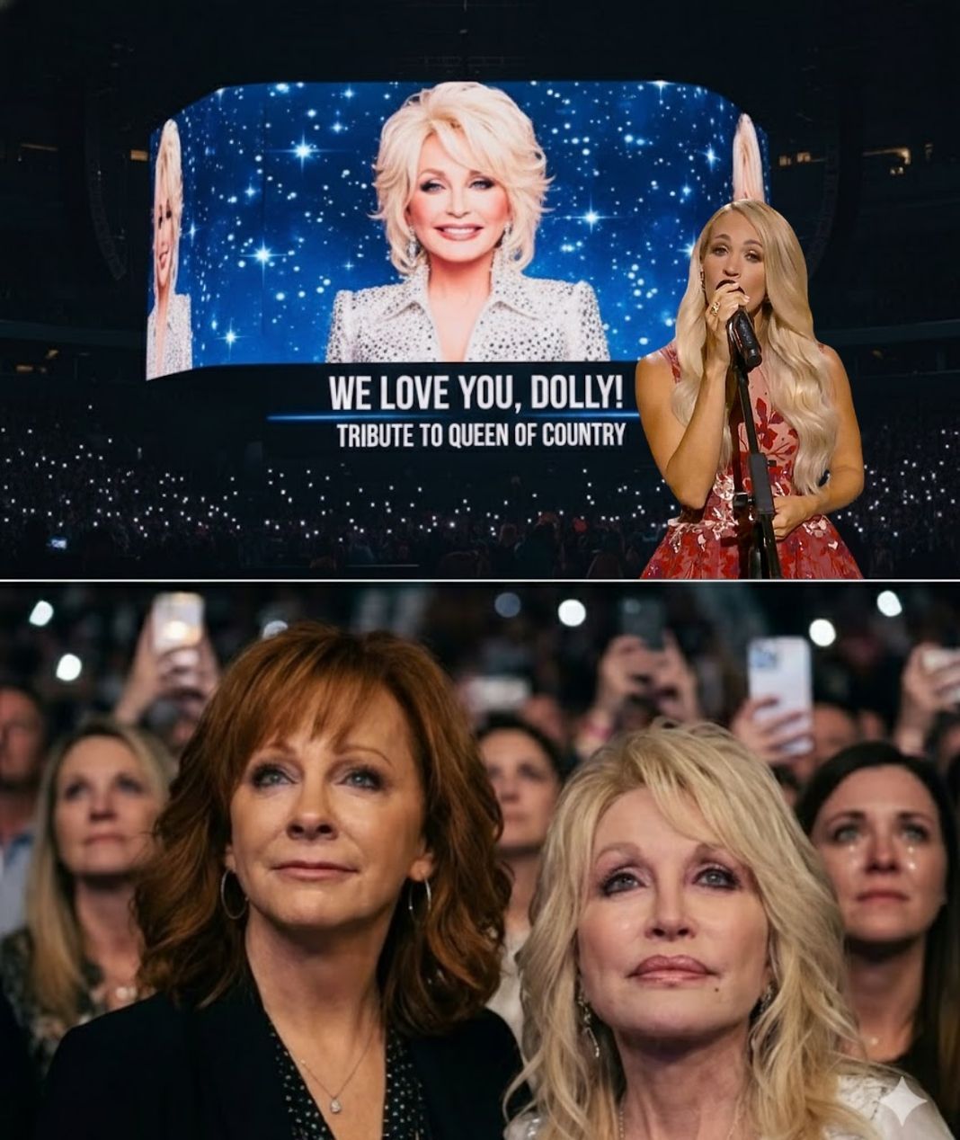 The lights dimmed unexpectedly. The band stepped back. Carrie remained alone at center stage. For a few long seconds, there was only silence — the kind that feels heavy, anticipatory, almost sacred. Then, with a soft breath and eyes lowered, she began to sing. It took only a line for the realization to ripple through the stadium: this was for Dolly Parton.