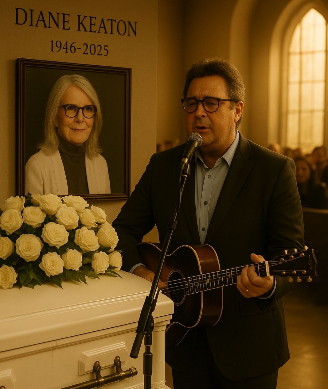 The chapel in Los Angeles was silent — a hush so deep it felt sacred. Golden light poured through the stained-glass windows, falling softly across rows of white roses that framed the altar. At the front stood Vince Gill, solemn and still, his black hat held against his chest. Before him rested the casket of Diane Keaton, the Oscar-winning actress whose brilliance and authenticity changed the face of American cinema. She passed away on October 11, 2025, at the age of 79.