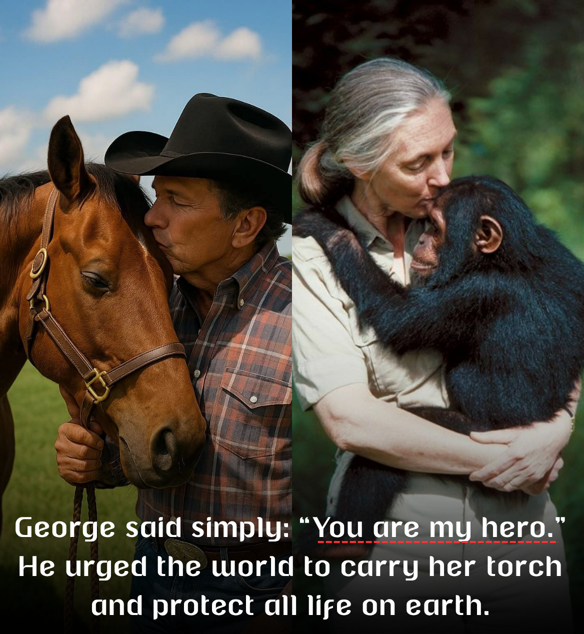 HEARTFELT TRIBUTE: George Strait honors the late Jane Goodall, calling her “a true hero of this planet.” He shared that his love for animals was first inspired by her work, leading him to rescue and care for wounded animals on his own ranch, especially horses. Remembering her groundbreaking research, tireless travels, and unshakable hope for future generations, George said simply: “You are my hero.” He urged the world to carry her torch and protect all life on earth.