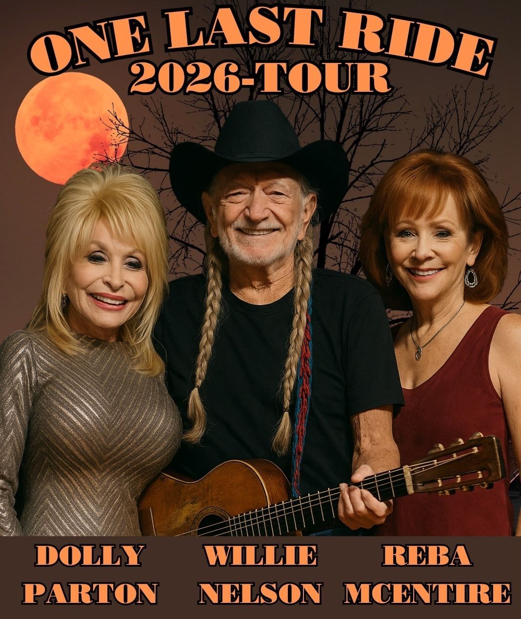 The country music world is bracing for an event that will be remembered for generations. Three of the most beloved figures in American music — Dolly Parton, Reba McEntire, and Willie Nelson — have officially announced they will join forces for the 2026 “One Last Ride” tour, a once-in-a-lifetime collaboration that promises to be both a farewell and a grand celebration. After years of rumors and whispers, the confirmation has sent waves of excitement across the industry, sparking a surge of anticipation from fans old and new.