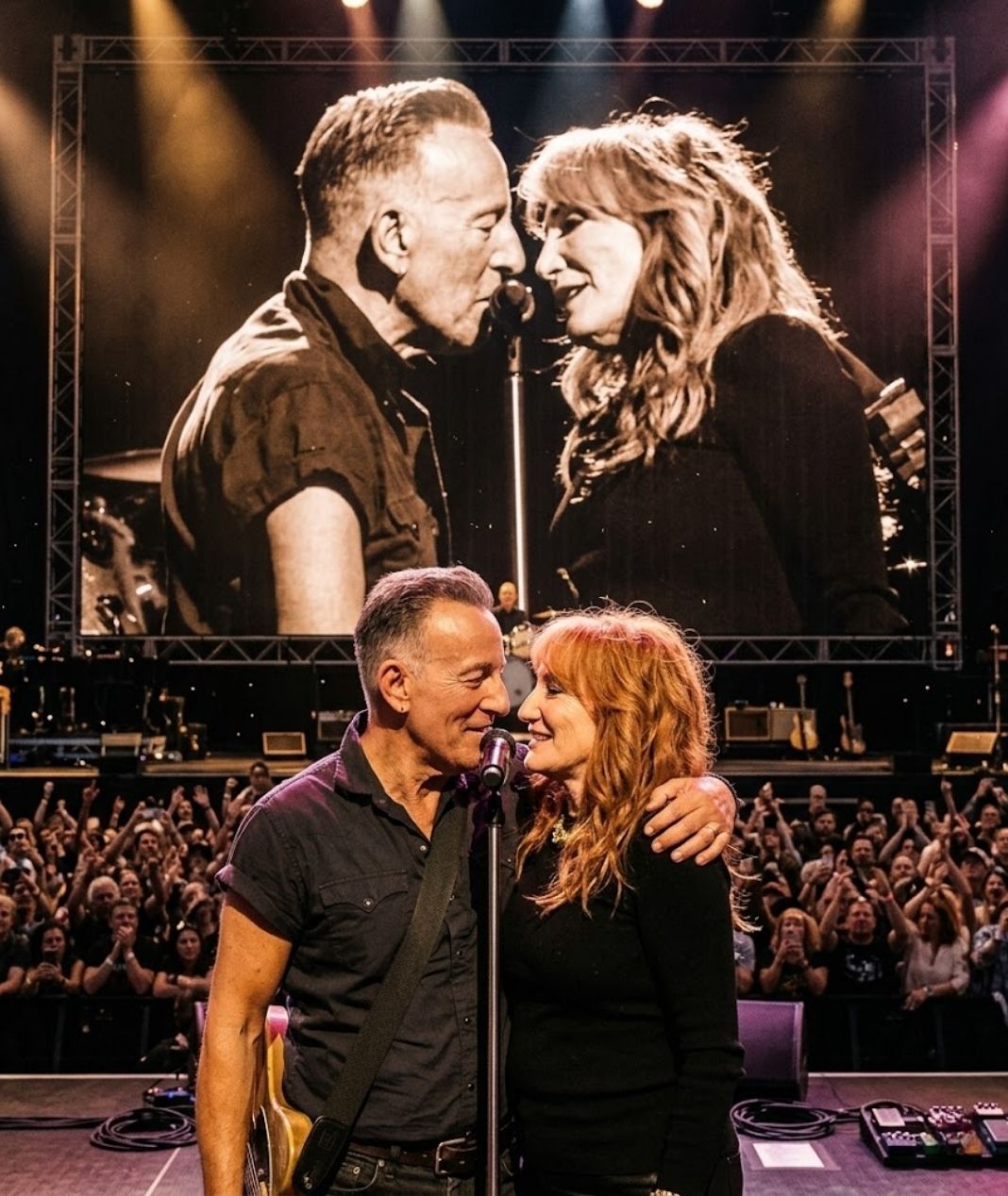 From the first notes, the audience could sense the unique chemistry between the two performers. Bruce Springsteen delivered the opening lines with his familiar gravel-edged voice, while the band held the rhythm steady beneath the dimmed stage lights. As the song unfolded, Patti Scialfa added her harmonies, creating a warm vocal blend that carried through the arena.