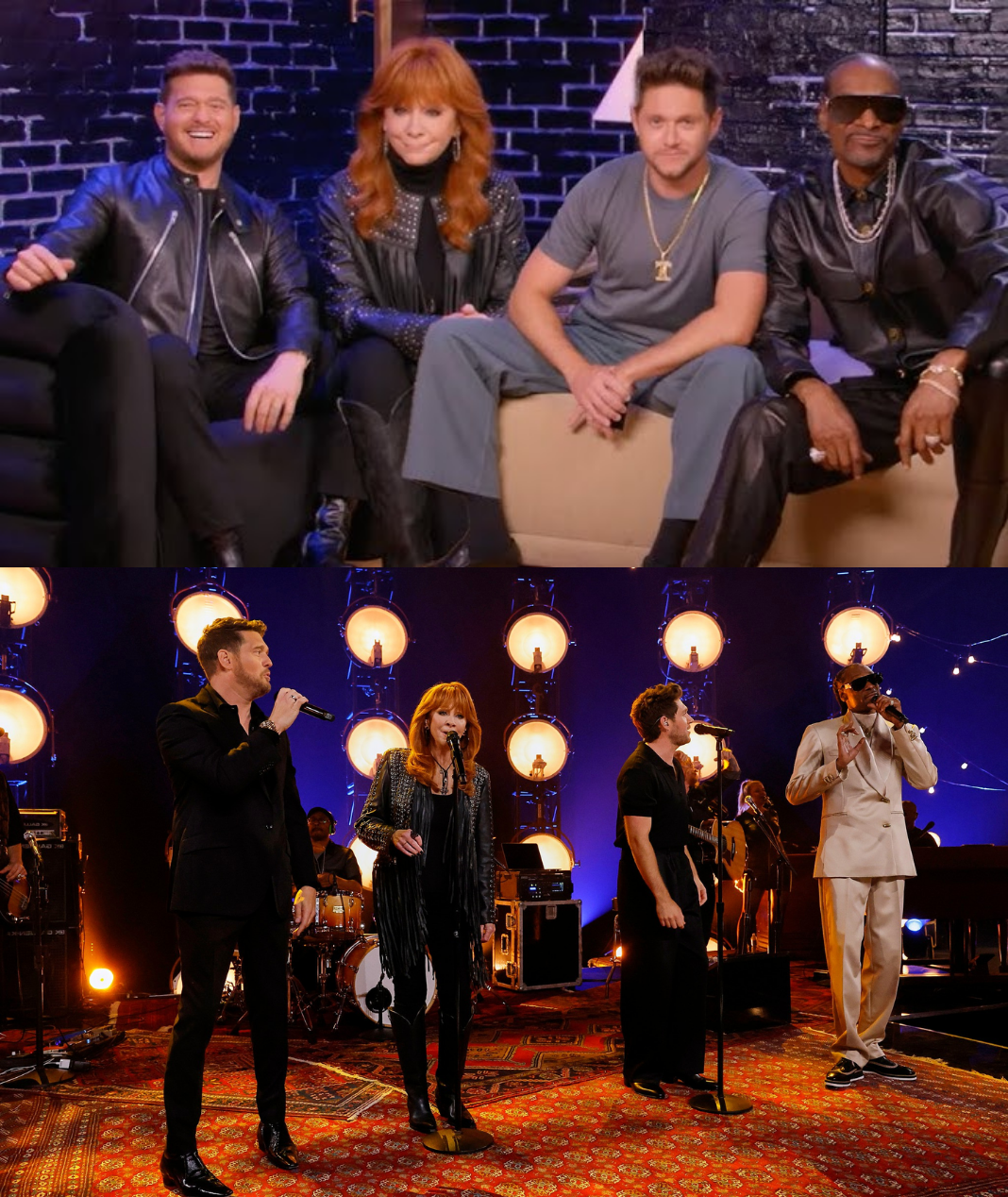 The unlikely quartet turned the stage into a full-on party. The chemistry between them was undeniable — four artists from four different musical worlds, all grooving together with ease and joy. As the chorus hit again, Bublé and Niall harmonized while Reba and Snoop traded playful ad-libs, the crowd clapping along to the infectious rhythm.
