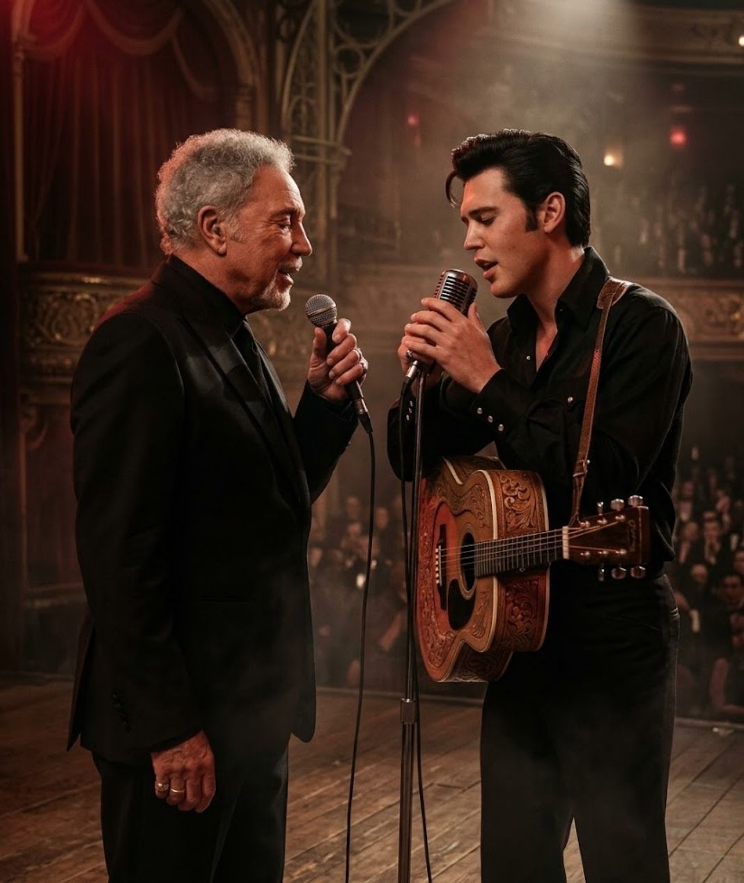 As the music began, the atmosphere was filled with anticipation. Elvis, relaxed yet confident, delivered his lines with the smooth charisma that had made him one of the most recognizable performers in the world. Tom Jones responded with the powerful projection that defined his own style, creating a striking contrast between the two voices.