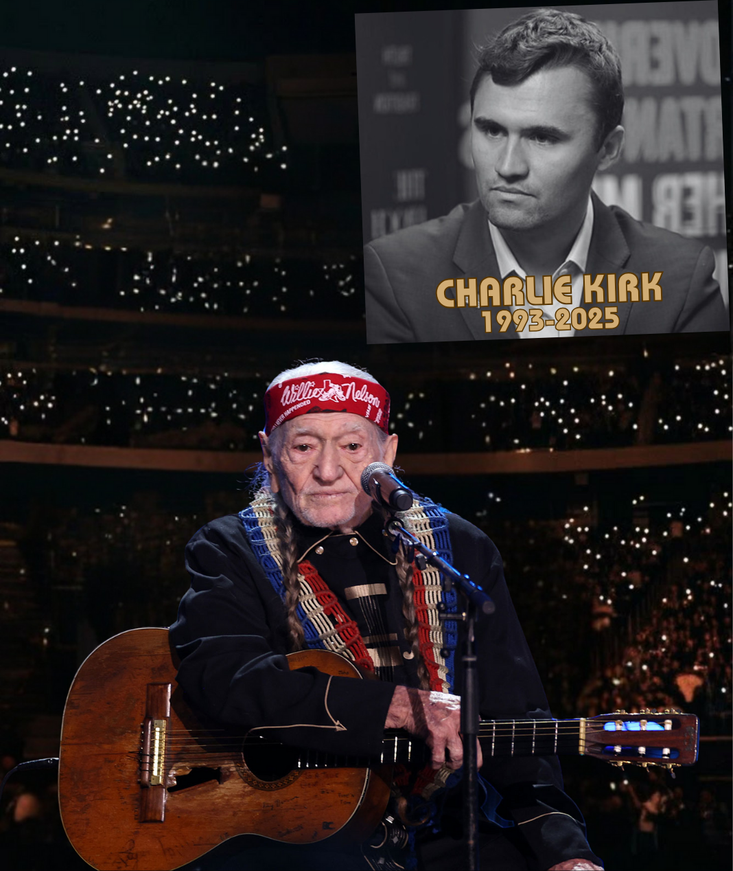 The stage was modest, the lighting soft, and the audience silent as Willie Nelson, wearing his familiar bandana and accompanied by his faithful guitar Trigger, began to play the opening notes. His voice — fragile yet steady, aged yet filled with emotion — carried the kind of truth that only a lifetime of love and loss can produce. For a moment, the vast crowd seemed to fade away, leaving only one man and his song.
